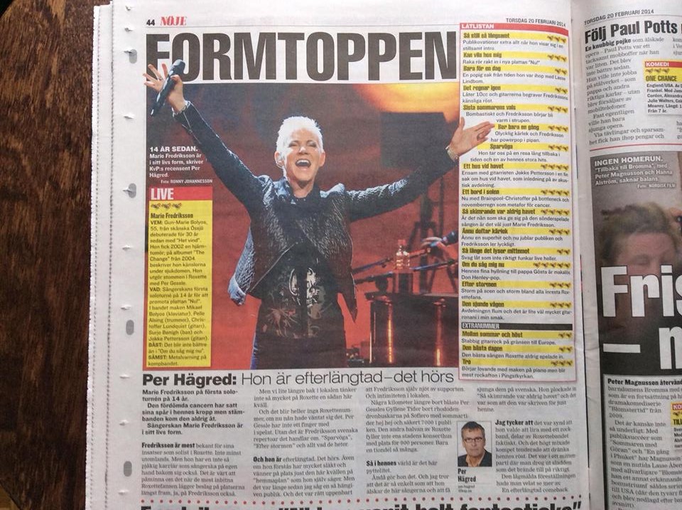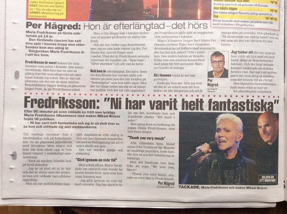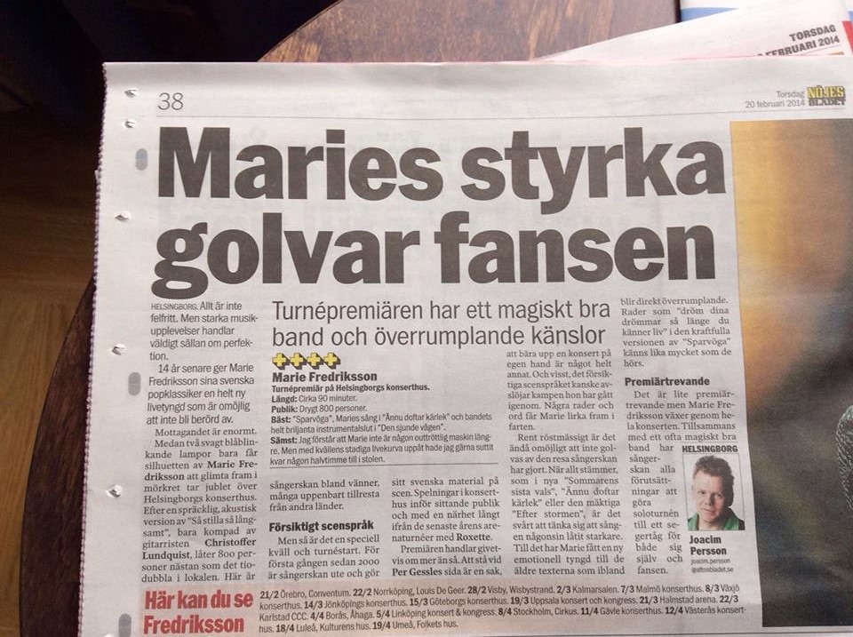 The first 2 rows (mostly international fans) stood up during the concert and tried to make the Swedes stand up, but it didn’t work as in Örebro, only during Mellan sommar och höst they joined the party. Marie and the band were again happy to see the fans in the front rows having fun and enjoying the concert so much and Christoffer and Jokke did a great job with the guitars.
