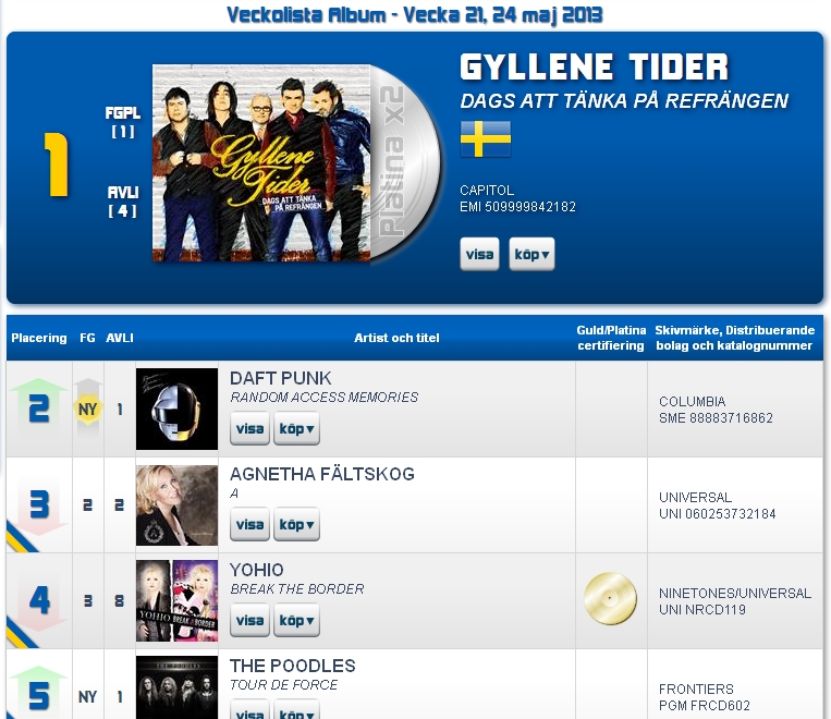 Gyllene Tider’s latest album is still No. 1 for the 7th week in a row! The already gold, platinum and double platinum record, Dags att tänka på refrängen entered the Swedish album charts on 3rd May, 2013.