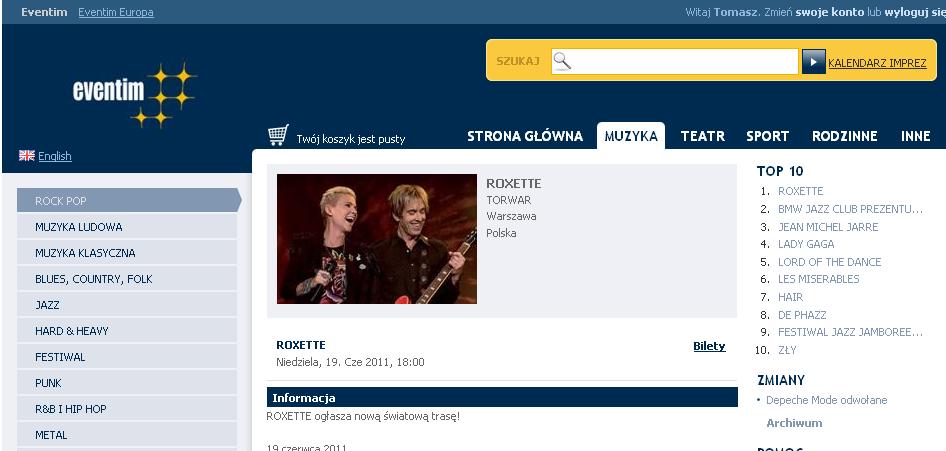The sale for Warsaw gig (June 19th, 2011) has just started today at 10 AM CET. Thanks to huge media coverage, Roxette is no 1 on Eventim.pl Top Ten charts at the moment. I do hope they will stay there untill the Warsaw gig will be sold-out 🙂